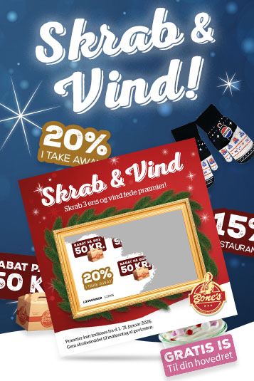 For hver 200 kr. du bruger i restauranten eller på take away, får du ét skrabelod. Læs mere