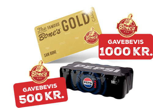 Præmier/vouchers kan bruges fra d. 1 - 31 januar og der kan kun indløses én værdikupon pr. bord eller take away ordre. Præmier/vouchers kan ikke indløses hos Bone’s Lalandia eller Nuuk. Har du vundet en fysisk gevinst, skal du kontakte os på marketing@bones.dk med dit lodnummer senest d. 31 januar 2026 for at få gevinsten udleveret.