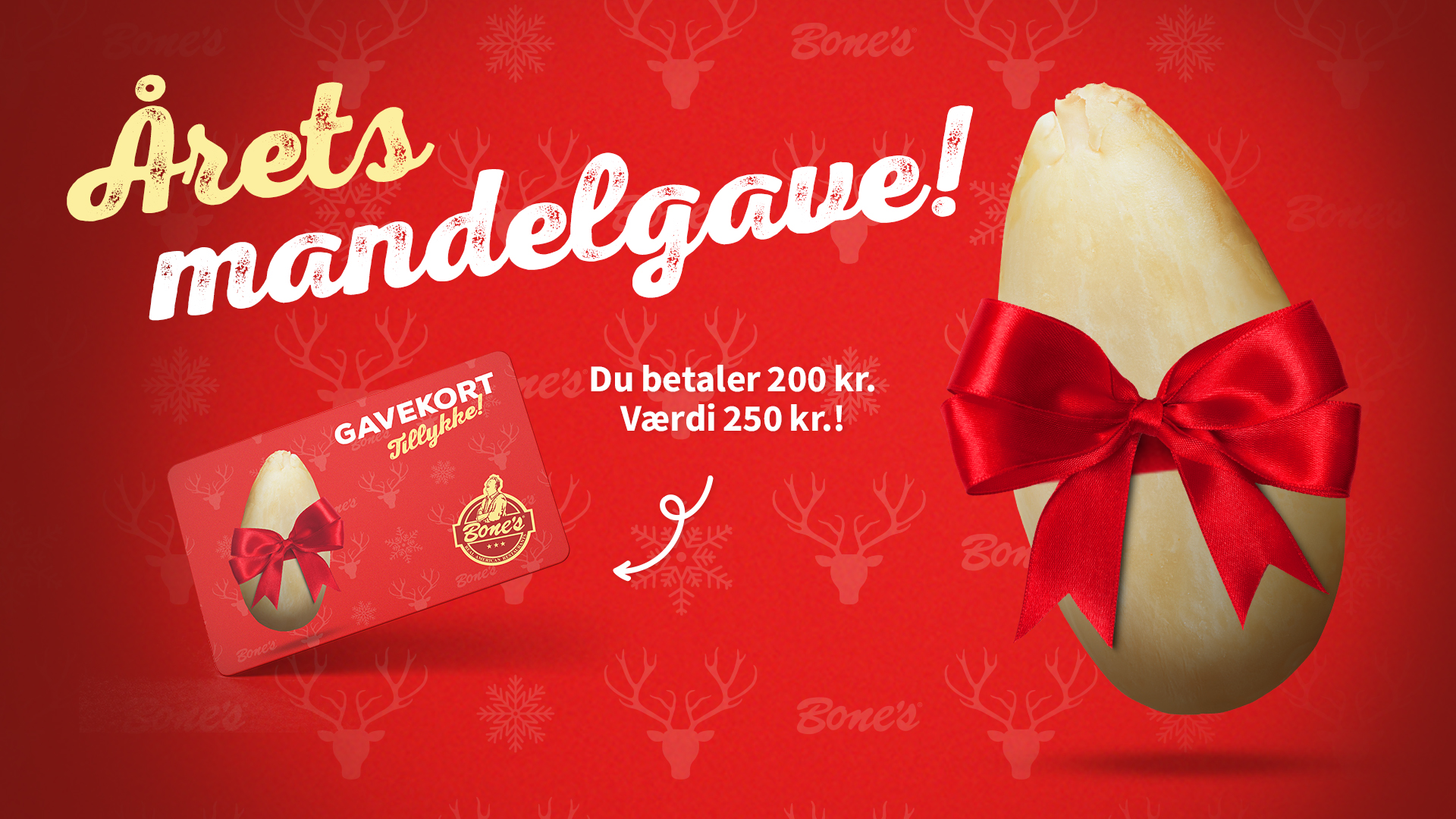 Mandelgavekort kan købes i restauranten og på www.bones.dk fra d. 17. november - 23. december. Kan indløses fra d. 1. januar 2026. Kan ikke købes hos Bone's Lalandia.